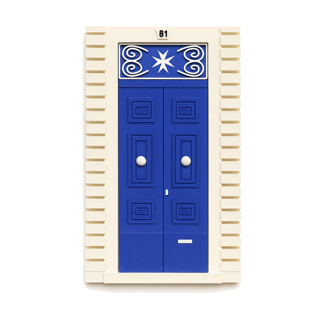 This Maltese door can be fully customised to your liking — including the door number, door colour, wall colour, and the colour of the iron details such as the knobs, letterbox, and decorative ironwork on top. Create a truly personalised piece made just for you.